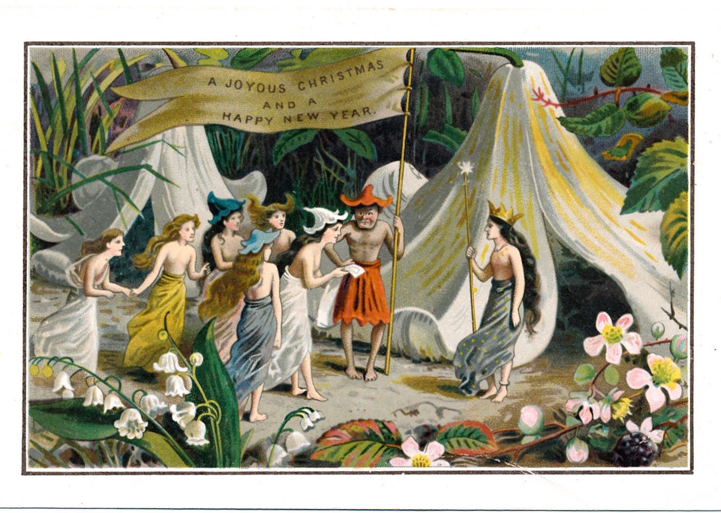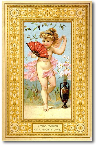 The one thing they get mentioned for most is starting a new trend of cards with naked or semi-naked children. Now, while that’s not what I find, um, attractive, it certainly got them notoriety. Cards with little kids were hugely popular, likely capitalizing on the Victorian love of all things sentimental, and showing a sweet little girl all decked out in her Christmas finery was a sure way to sell a card. But De La Rue hired a number of (actually mostly female) artists who, for reasons I’m not entirely sure of, decided to ditch the clothes and present these kids in semi-pastoral or almost pre-Raphaelite settings.