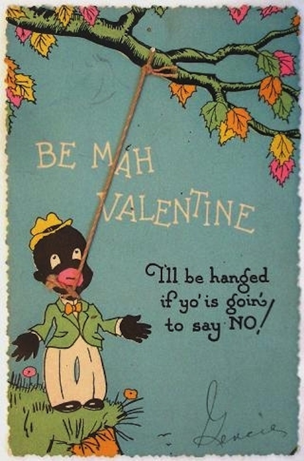 “I’m not saying I’m blind to the historical racism, but seriously — a lynching on a valentine card meant to be humorous? Nothing says I love you like a funny corpse? A joyful murder? I guess I should be happy it doesn’t compute.”