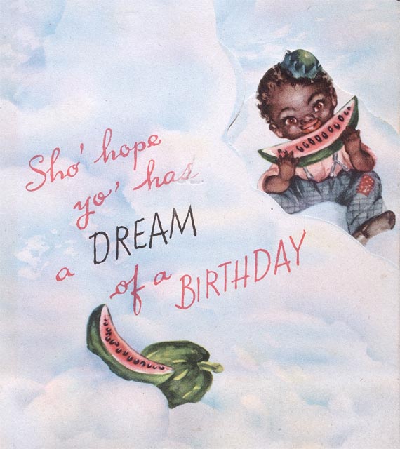 They mostly consist of broken English, exaggerated facial features, common stereotypes like eating watermelon, black black skin, slurs like “darkie,” associations with poverty, and overall a general sense of “simple” (as in developmentally delayed) innocence. And then if they’re presented as African, they’re of course savage and cannibalistic. But things get even uglier toward the end, so consider yourself warned.