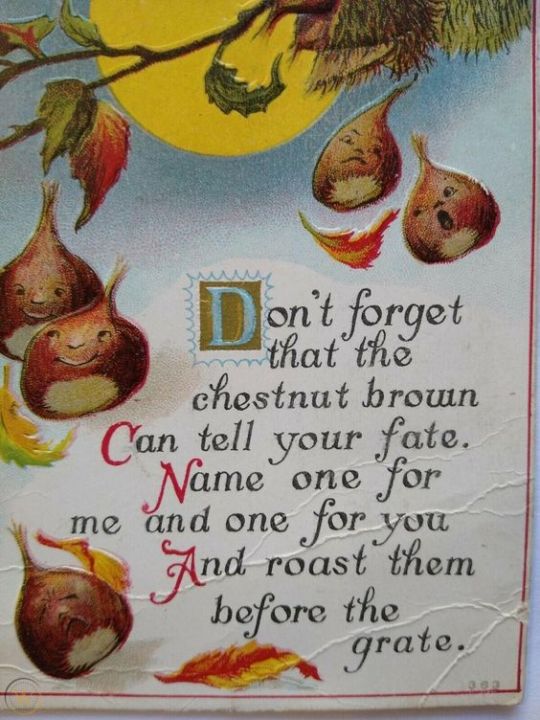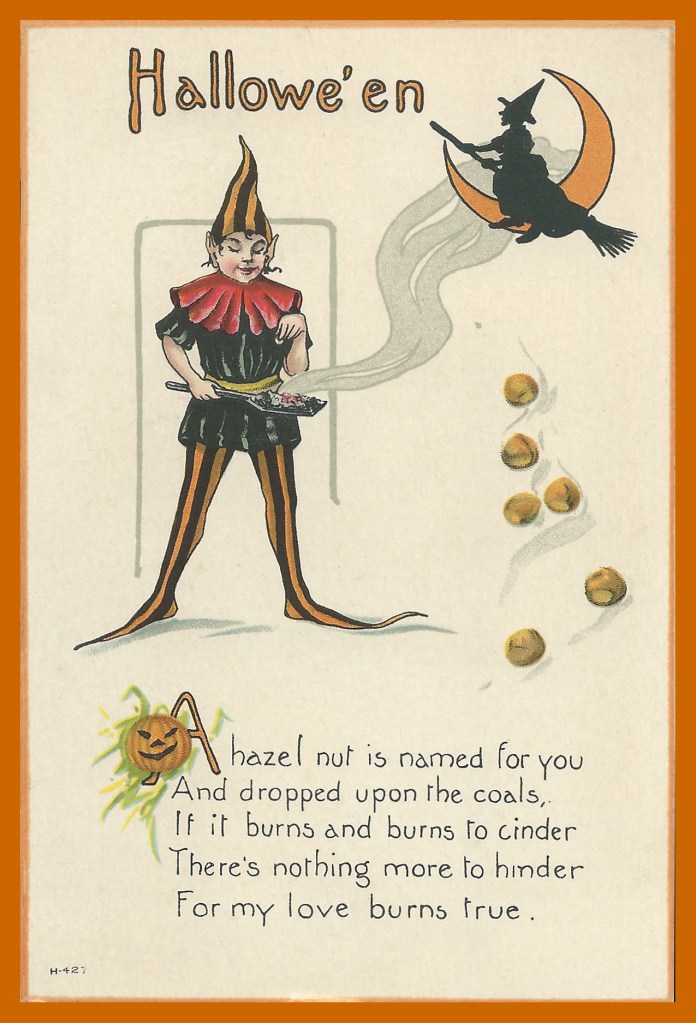This was such a common game that in the UK, Halloween was sometimes called “Nutcrack Night” or “Nutcracking Night” or something similar. The most common version of the game seems to be that you’d actually name your nuts. You might even write or scratch your name and your lover’s name into each one. Then you’d put them near the fire or, in some cases, right into the coals. Then, if your nut didn’t pop, explode, or completely burn up, it meant you were constant in your love. And whoever’s nut did pop, explode, or burn up completely would be the one who would lose faith or cheat or whatever. If they just turned to coals and smoldered together, then that was a sign that your love would be constant and passionate forever.
